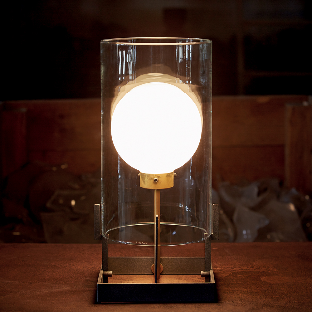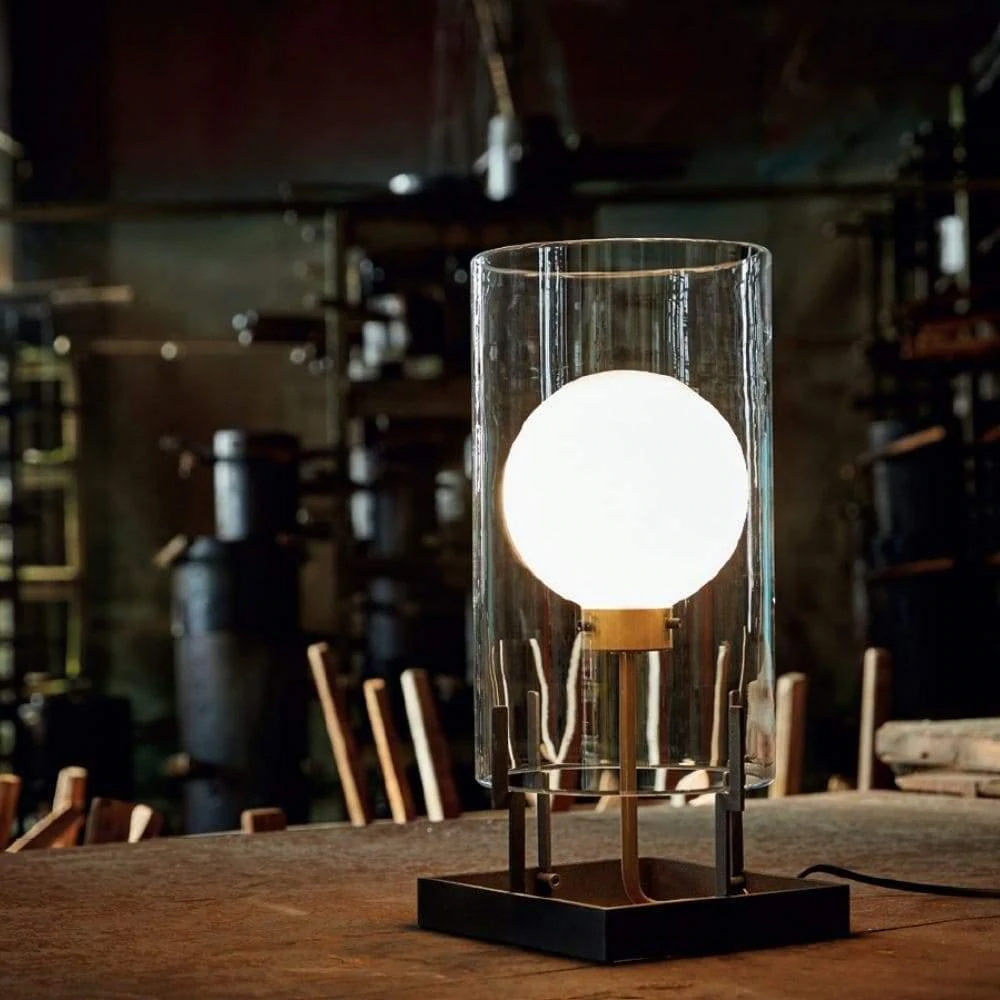 Il cilindro in cristallo trasparente si lega ad una struttura in metallo verniciato antracite ed ottone naturale. La sfera all'interno sembra quasi sospesa. Uso interno.