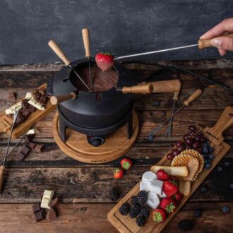Con questo elegante e durevole servizio fonduta (220 V) avrete il set ideale per tutti i tipi di fonduta (cioccolato, formaggio, brodo o bourguignonne). Inoltre, non avete bisogno di un fornello, la pentola si riscalda da sola. La pentola elettrica per fonduta in ghisa con rivestimento antiaderente in smalto ha una capacità di 2,15 litri. Grazie al rechaud con pratico regolazione della temperatura, troverete sempre la temperatura ideale per la vostra serata fondue. L'apparecchio mantiene la temperatura selezionata e garantisce ore di divertimento spensierato. Incluso nella confezione sono anche 8 forchette fonduta in acciaio inox con manici in quercia, 1 paraspruzzi e un sottopiatto in quercia.